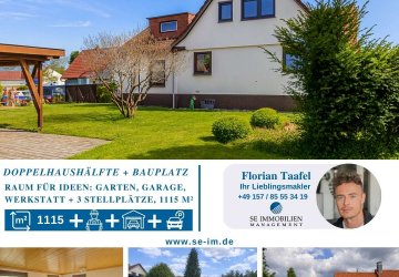 Raum für Ideen: Doppelhaushälfte mit Bauplatz, großem Garten und Garage85 m² Wohnfläche • 1.115 m² Grundstücksfläche • 5 Zimmer • 3 Schlafzimmer • 1 Badezimmer