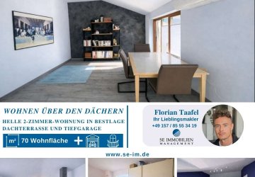 Wohnen über den Dächern: Helle 2-Zimmer-Wohnung mit Dachterrasse und Tiefgarage in Bestlage70 m² Wohnfläche • 2.270 m² Grundstücksfläche • 2 Zimmer • 1 Schlafzimmer • 1 Badezimmer