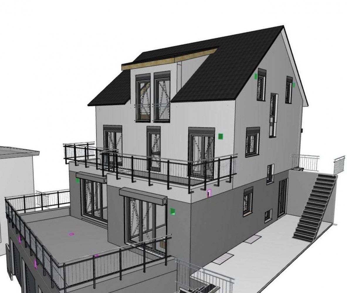 Aktuell genehmigt wurde ein großes Einfamilienhaus mit Einliegerwohnung und 3 Garagen.