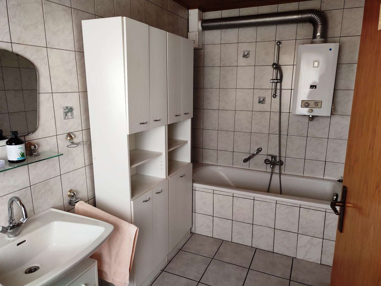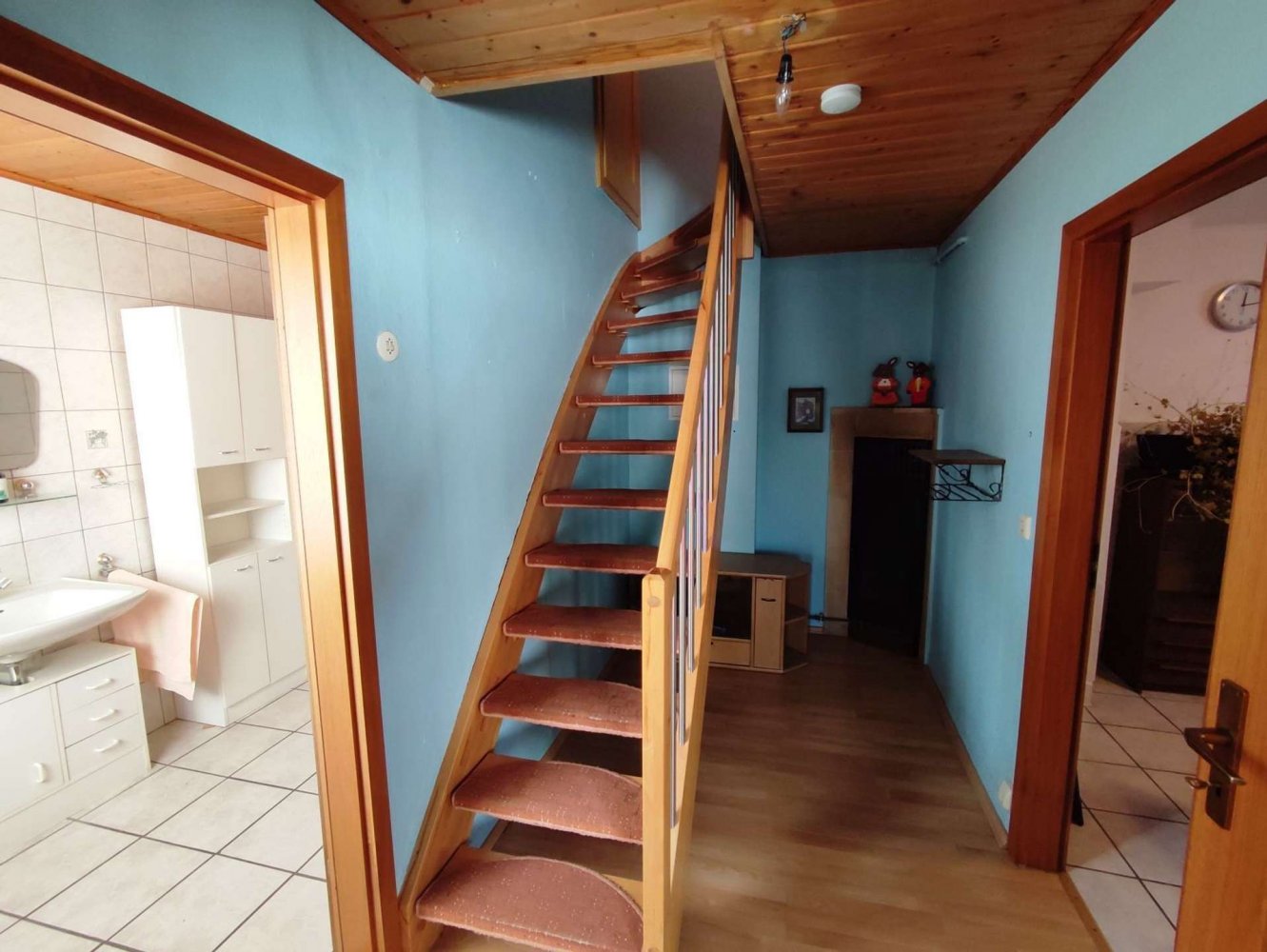 Links vom Flur aus befindet sich das Bad, geradeaus über die Treppe gelangen Sie in die oberen Räume, das Schlaf- und das Kinderzimmer sowie den oberen Balkon.
