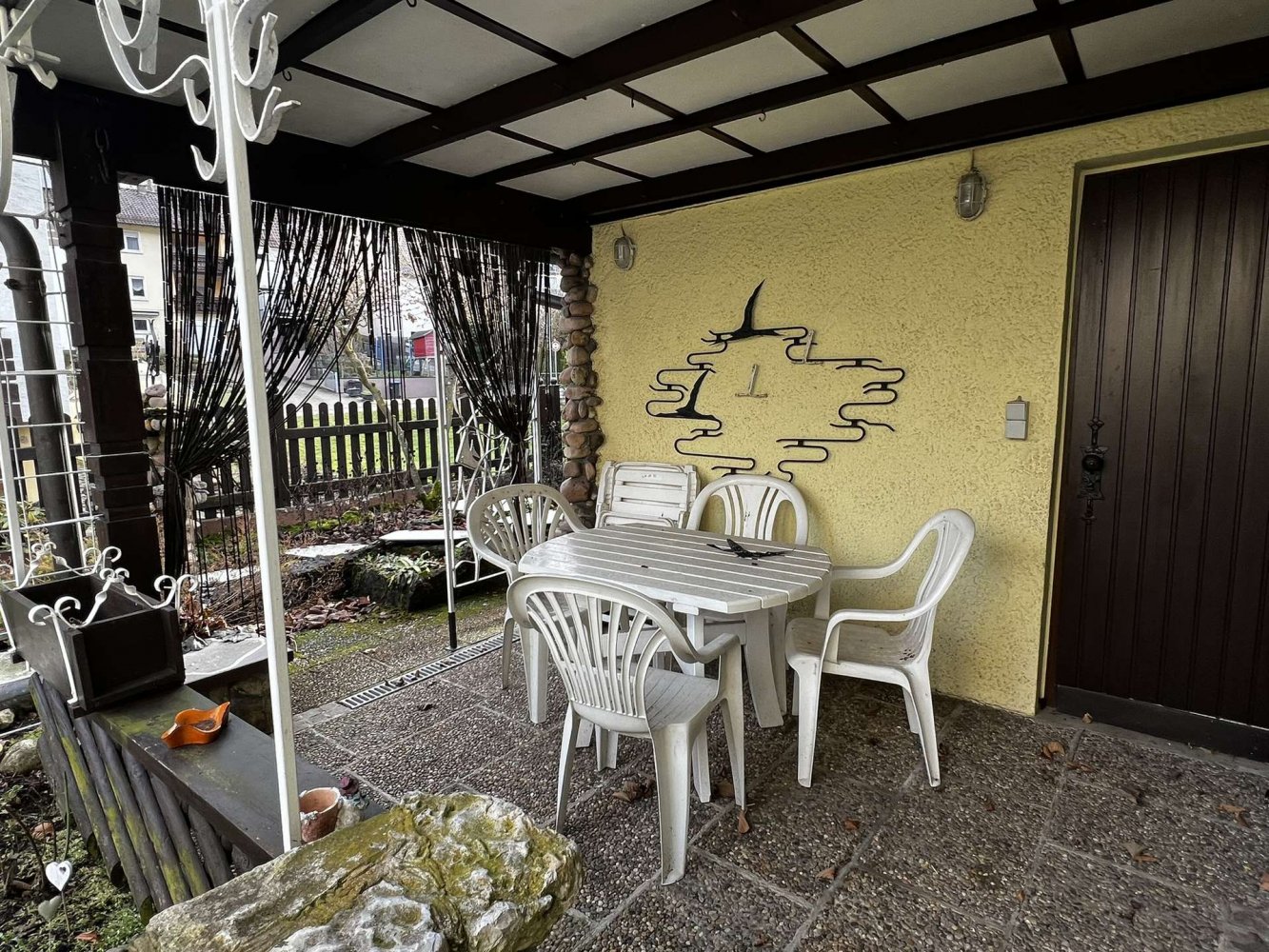 Der schöne Garten mit überdachtem Freisitz, einem kleinen Außenkamin und Zugang zur Garage, bietet einen schönen Rückzugsort und Möglichkeiten zur freien