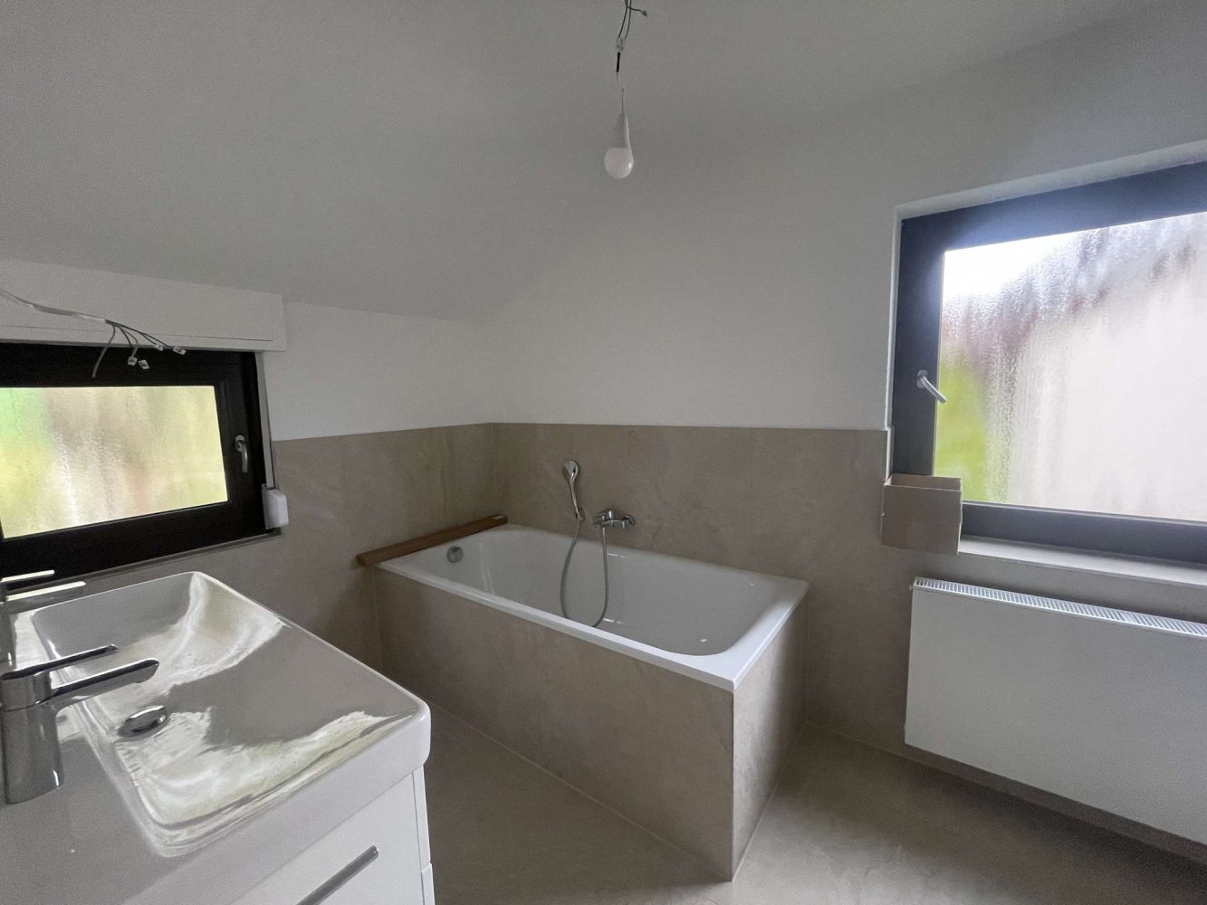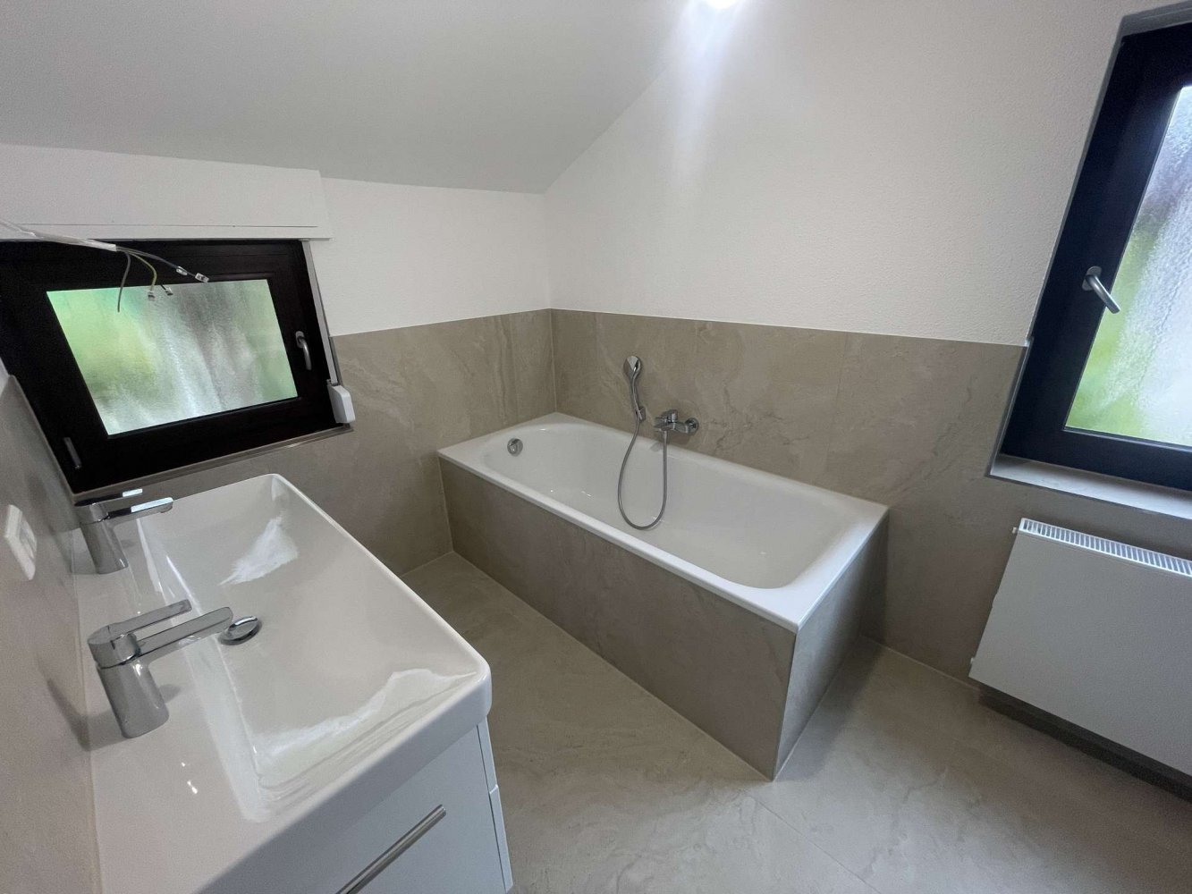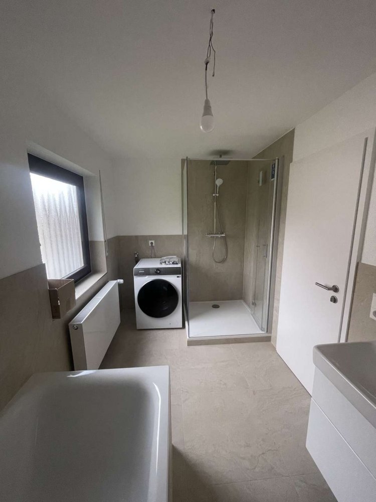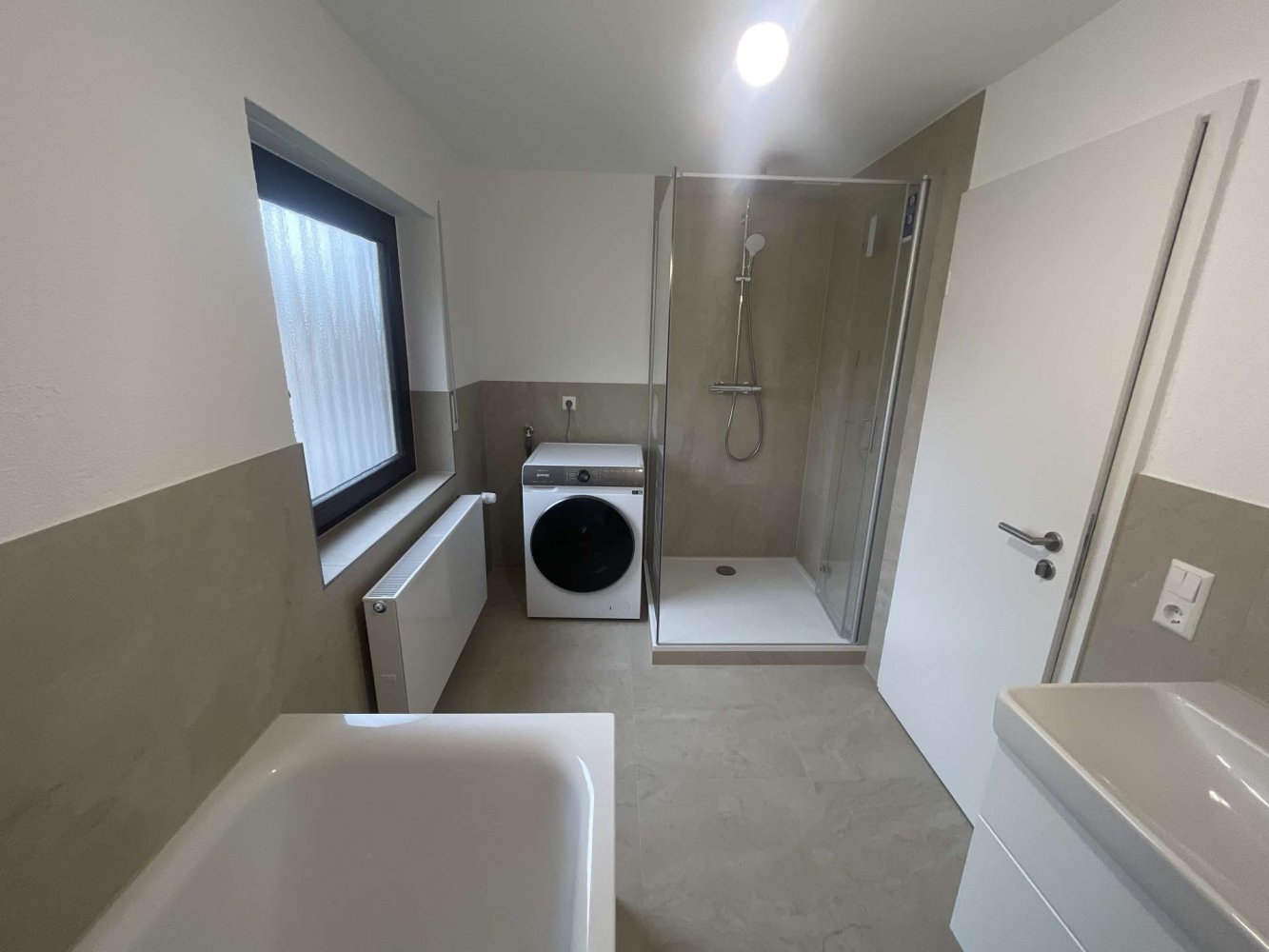 - Tageslichtbad mit Badewanne, ebenerdiger Dusche und Waschtrockner