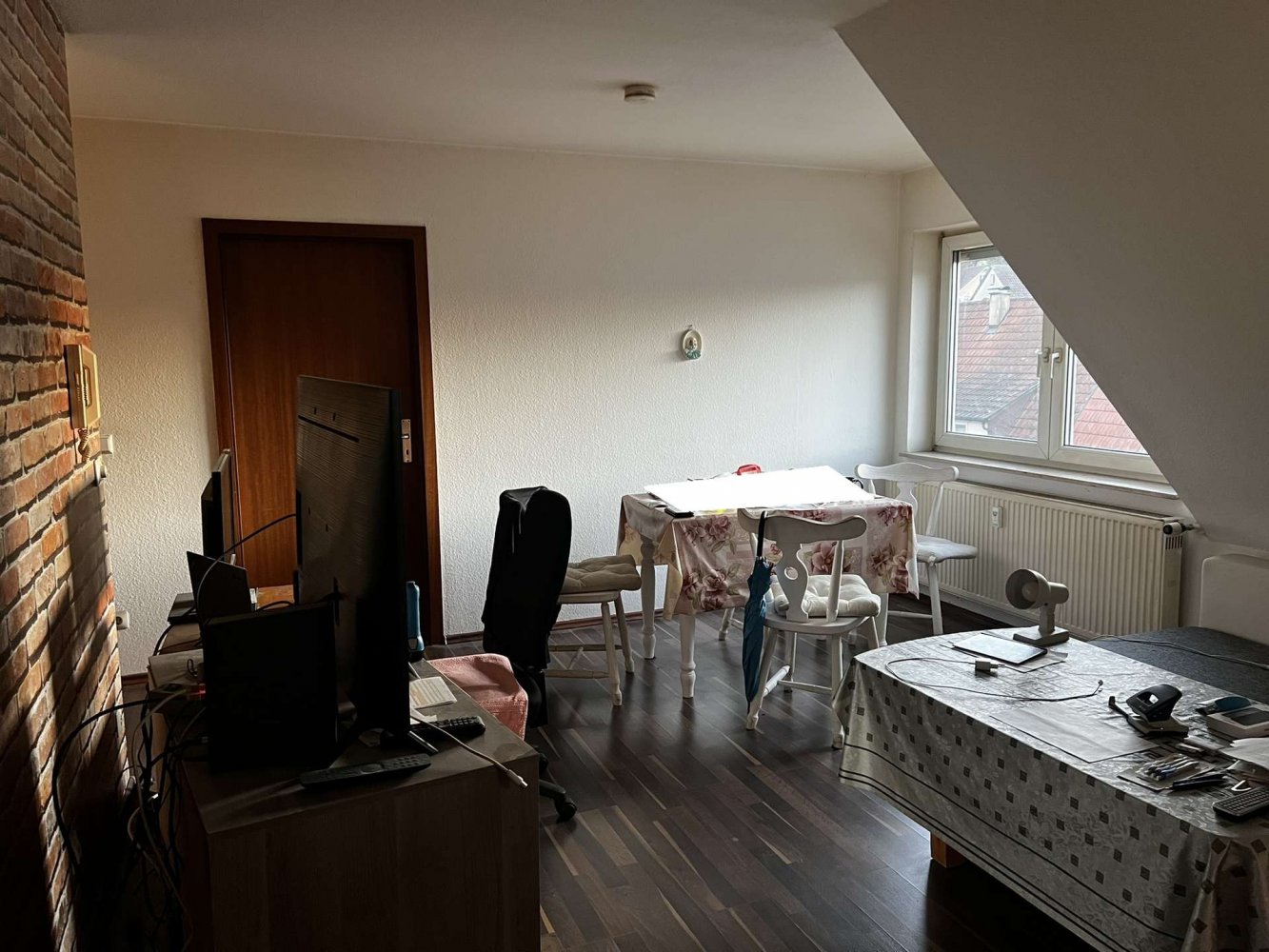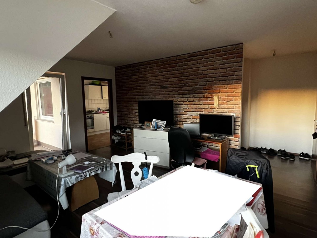 Die Wohnung mit ca. 44,79 m² befindet sich im Dachgeschoss eines Mehrfamilienhauses (Baujahr 1991, massive Bauweise). Der Grundriss umfasst einen hellen Wohn- und Essbereich, ein separates Schlafzimmer, eine funktionale Küche sowie ein Bad mit Wanne. Kunststofffenster sowie Laminat- und Fliesenböden sind vorhanden.