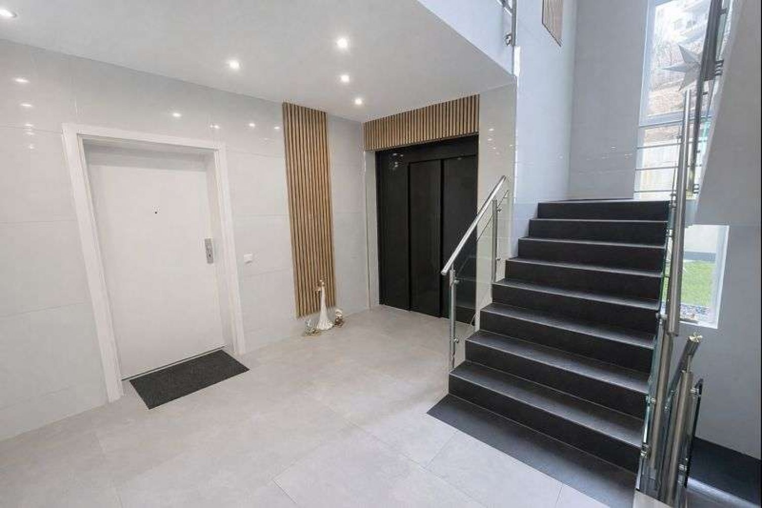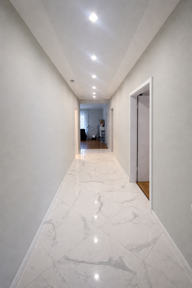 Abgehängte Decken mit stilvoll integrierten Lichtquellen und edle Marmorfliesen unterstreichen den hochwertigen und eleganten Charakter der Wohnung. Die überdachte Terrasse bietet einen idealen Rückzugsort zum Entspannen im Freien.