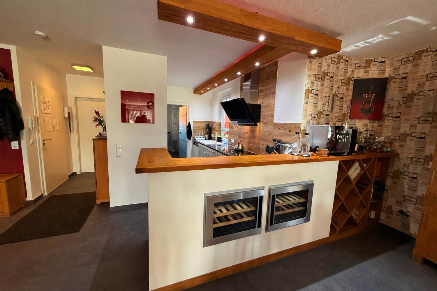 Die Wohnung überzeugt durch ein offenes Wohnkonzept, helle Räume, hochwertige Fliesen, einen Kaminofen sowie eine stilvolle Einbauküche, welche im Preis enthalten ist. Der großzügige Wohn- und Essbereich mit Balkon bildet das Herzstück der Wohnung.