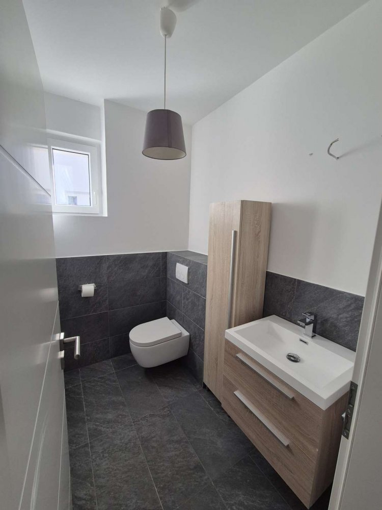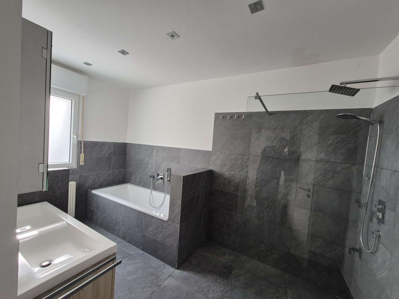 - Tageslichtbad mit Wanne, ebenerdiger Dusche und Doppelwaschtisch + Toilette