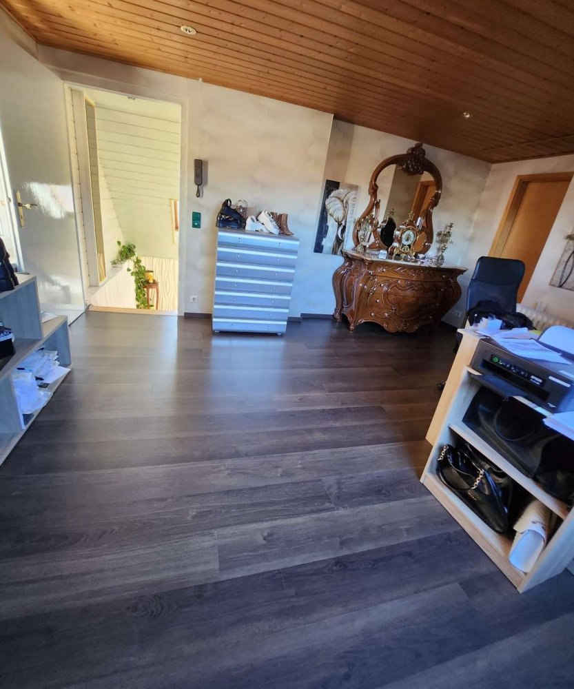 35 qm welcher unterteilt ist mit Torckenbauwänden, Kunststoffschaufenster doppeltverglast, Eingangstüre aus Kunststoff, Laminat, Tageslicht-WC gefliest, Waschbecken und halbhoch gefliest.