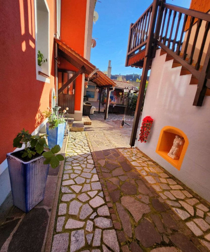 Das Haus verfügt über einen schönen gepflasterten Hof.