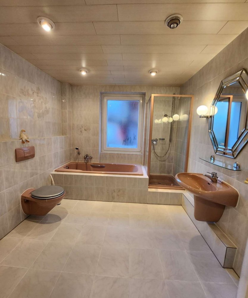 1 Badezimmer, mit Fliesenboden, deckenhoch gefliest, Fenster mit Milchglasverglasung, Dusche, Badewanne, WC und Waschbecken