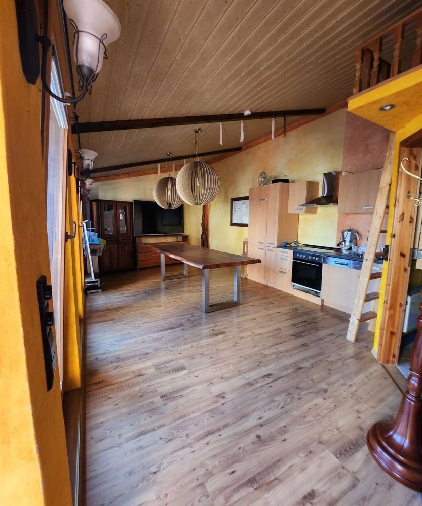 1 großer Raum mit Laminatboden, Holzdecke, Holzfenster doppeltverglast und Einbauküche