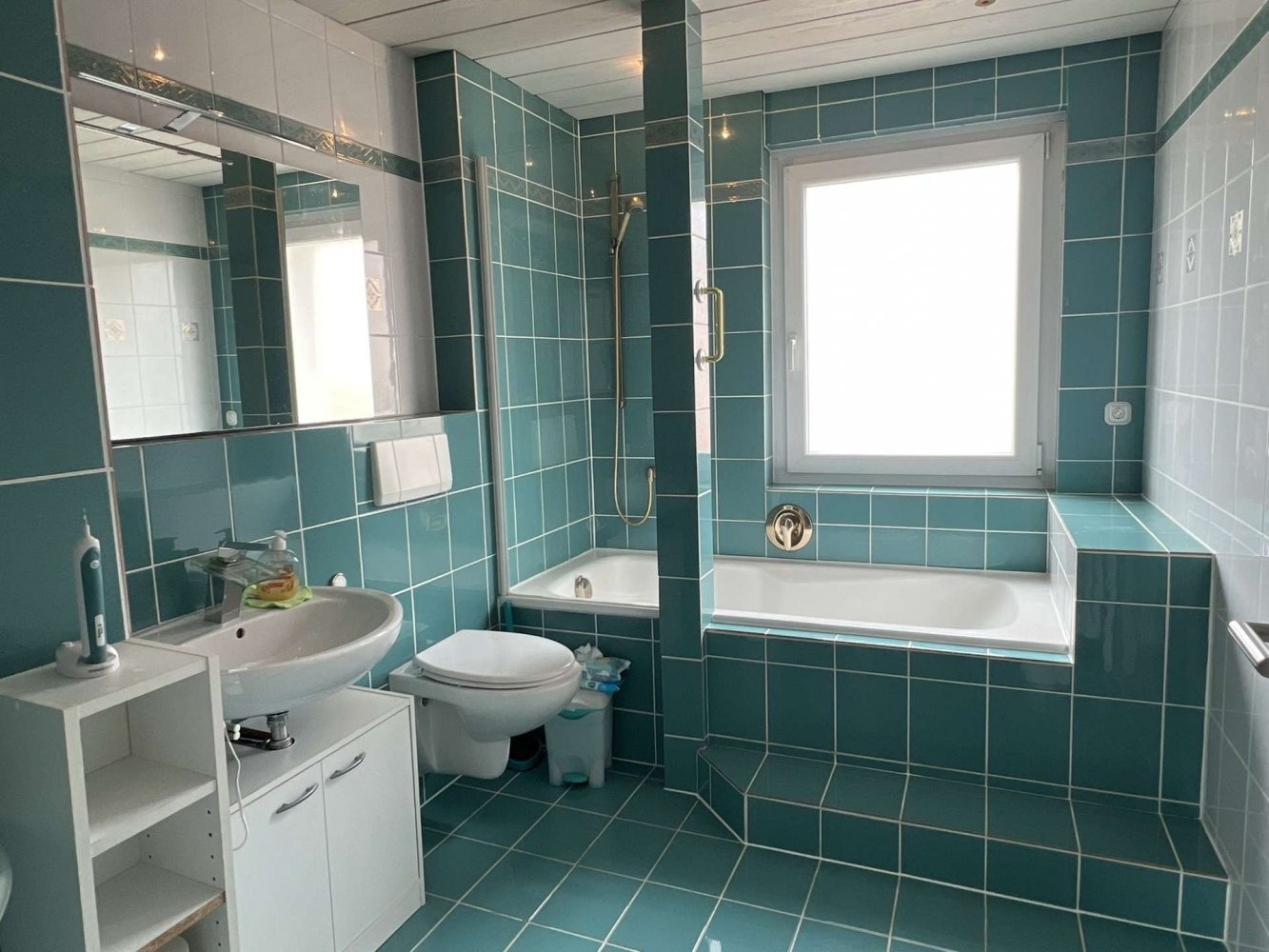 1 Badezimmer, mit Fliesenboden, deckenhoch gefliest, Fenster mit Milchglasverglasung, Dusche, Badewanne, WC, Waschbecken und Waschmaschinenstellplatz