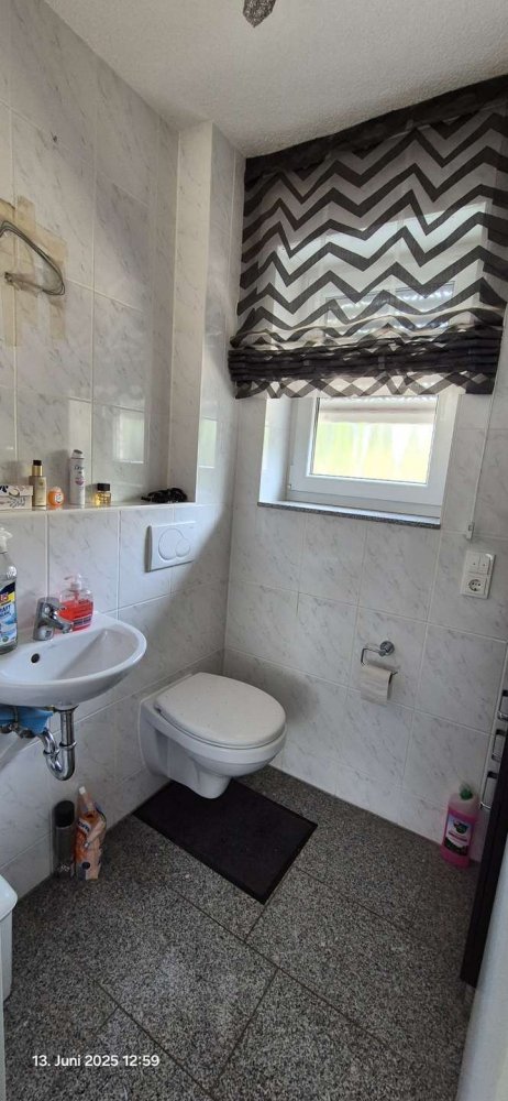 Tageslichtbad, deckenhoch gefliest, Doppelwaschtisch, Dusche und Hänge-WC mit Wandspülung