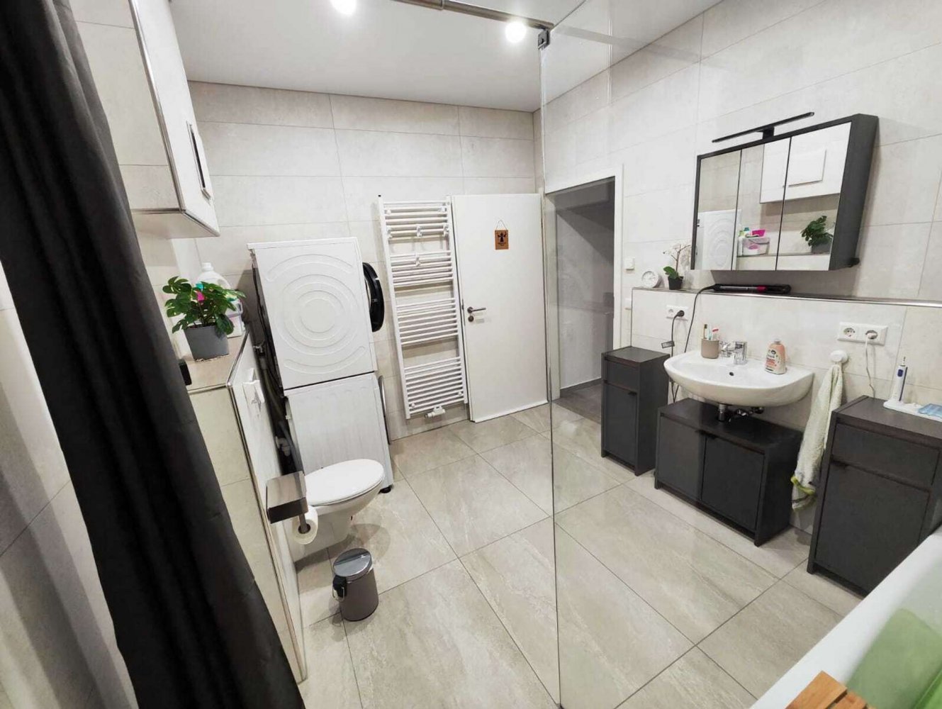 * Badezimmer mit Badewanne, Dusche, Waschtisch und WC sowie Waschmaschinenanschluss und Handtuchheizkörper