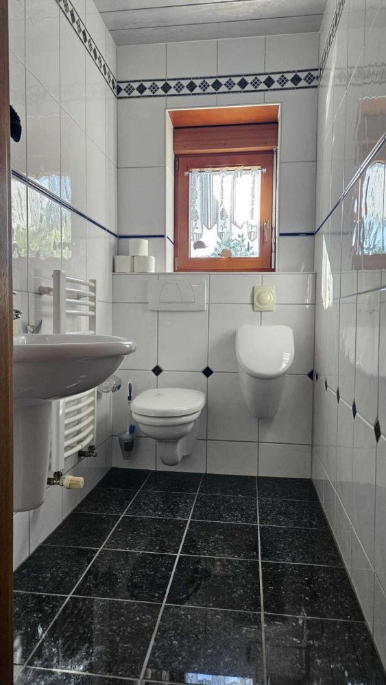 - Gäste-WC: Waschtisch, WC und Pissoir (deckenhoch gefliest)
