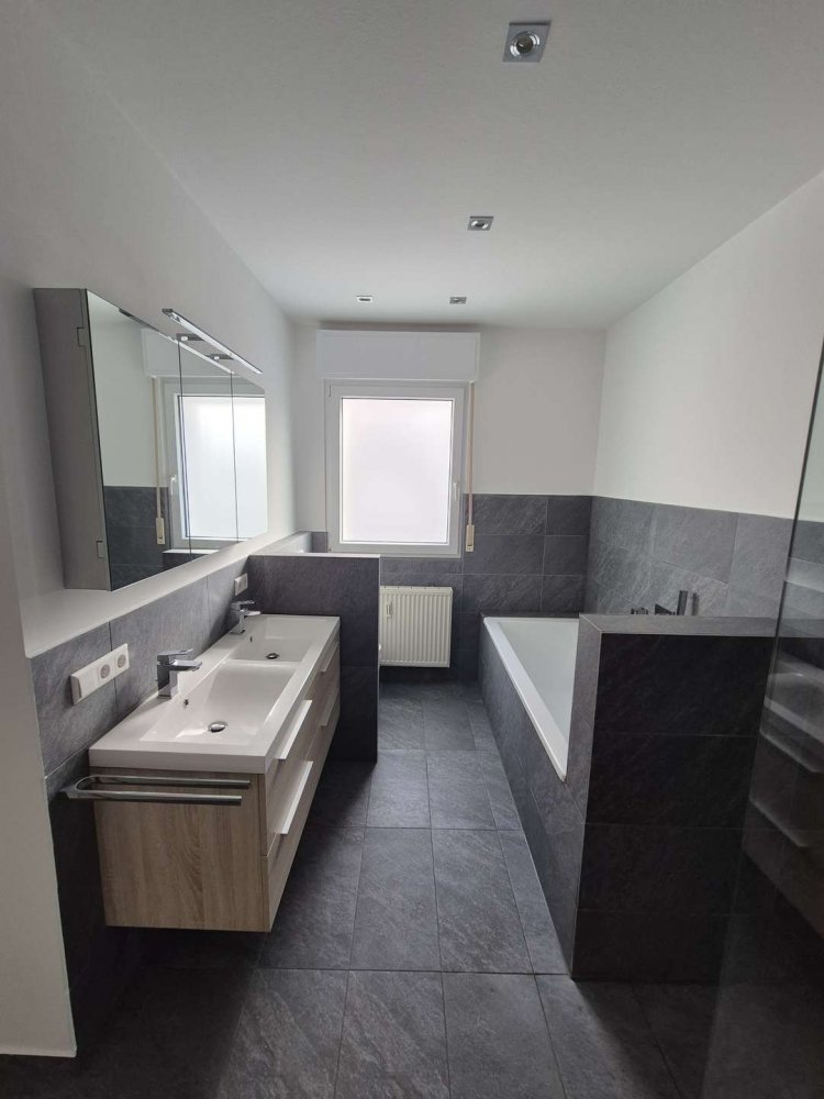 - Tageslichtbad mit Wanne, ebenerdiger Dusche und Doppelwaschtisch + Toilette
