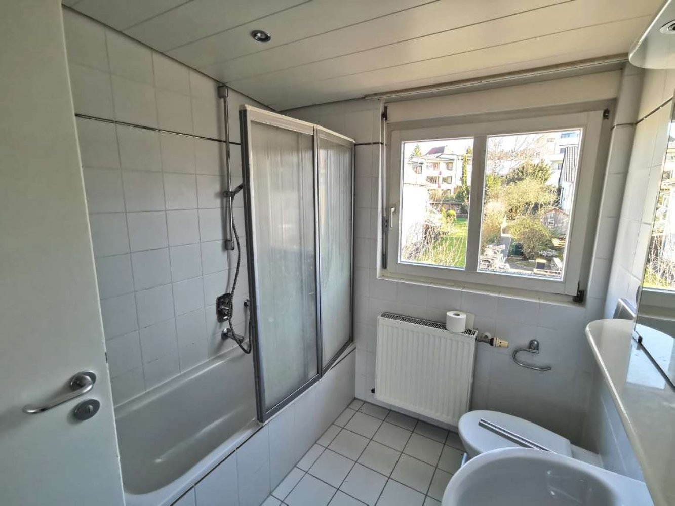 - Tageslicht-Badezimmer mit Badewanne, WC, Waschbecken, Spiegelschrank