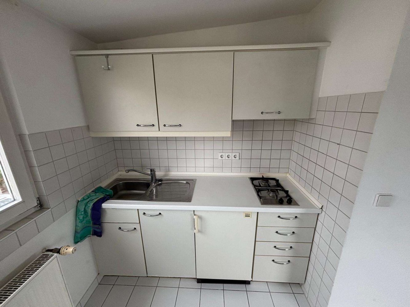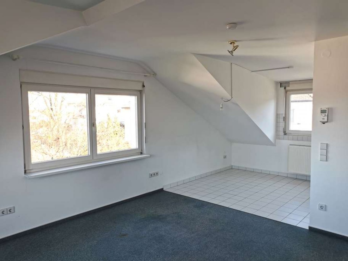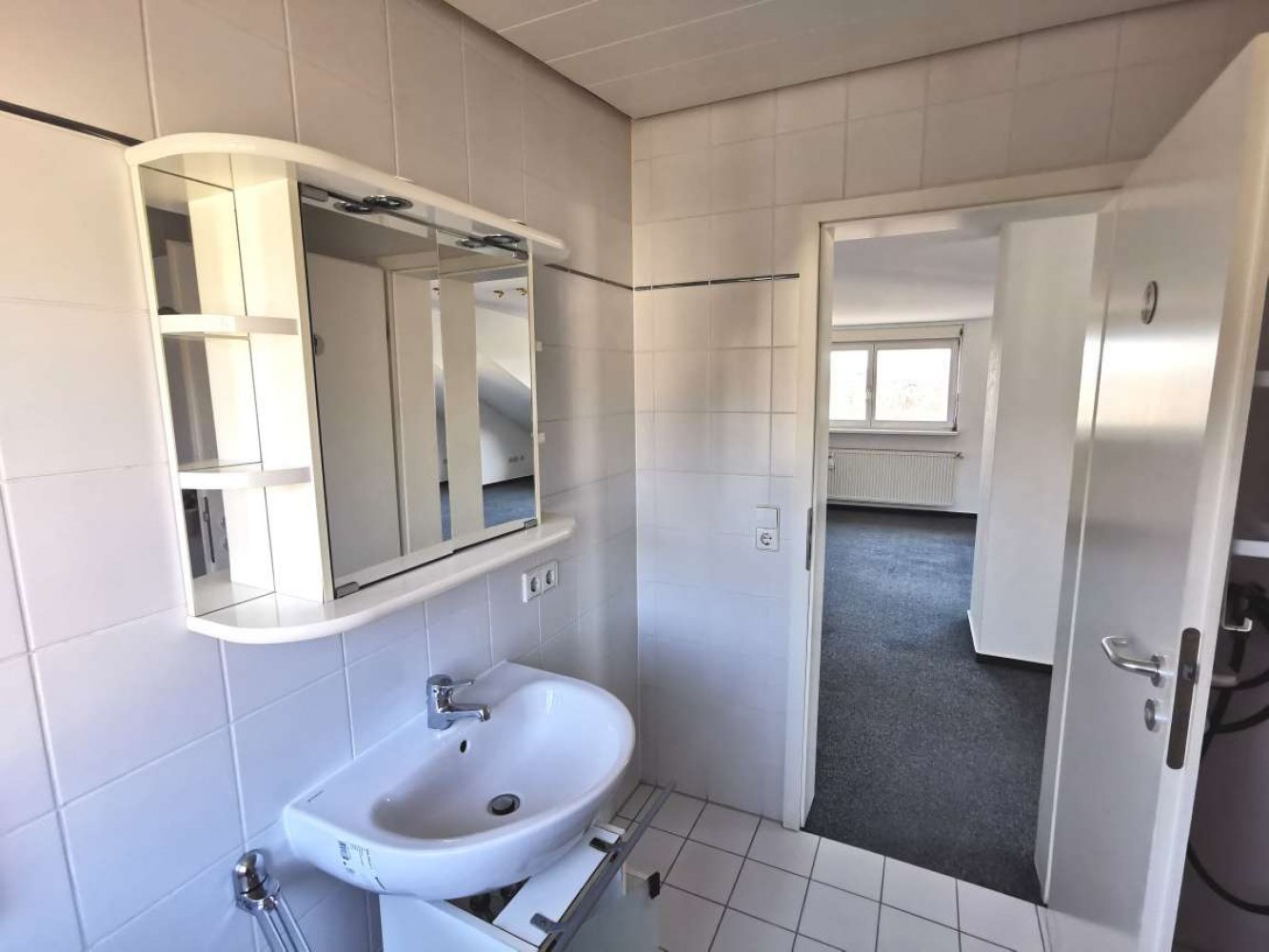 - Teppichboden im Wohn-Schlafbereich, weiße Fliesen in Bad und Küche
